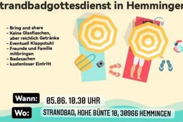 Am Pfingstsonntag gehts los: Wir starten die Sommersession mit unserem ersten langersehnten Strandbadgottesdienst in Hemmingen. Jeder ist willkommen und der Eintritt ist kostenlos dabei! Es erwartet euch ein gemütlicher, familienfreundlicher und ungezwungener Gottesdienst der anderen Art.